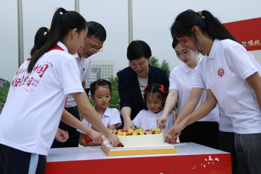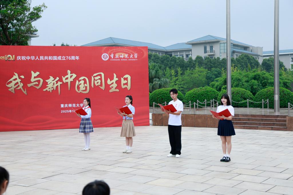 升国旗仪式庄严举行,鲜艳的五星红旗伴随着嘹亮的国歌缓缓升起,全体师生肃立,行注目礼,共唱国歌,向祖国表达崇高敬意与深切祝福。大、中、小学生代表献上诗朗诵《复兴赋・山河新章》,字里行间满是对祖国的热爱与自豪。活动现场,学校领导为与新中国同生日的师生代表送上温馨祝福。张艳、王国胤与过生日师生代表同切生日蛋糕,共许家国心愿。