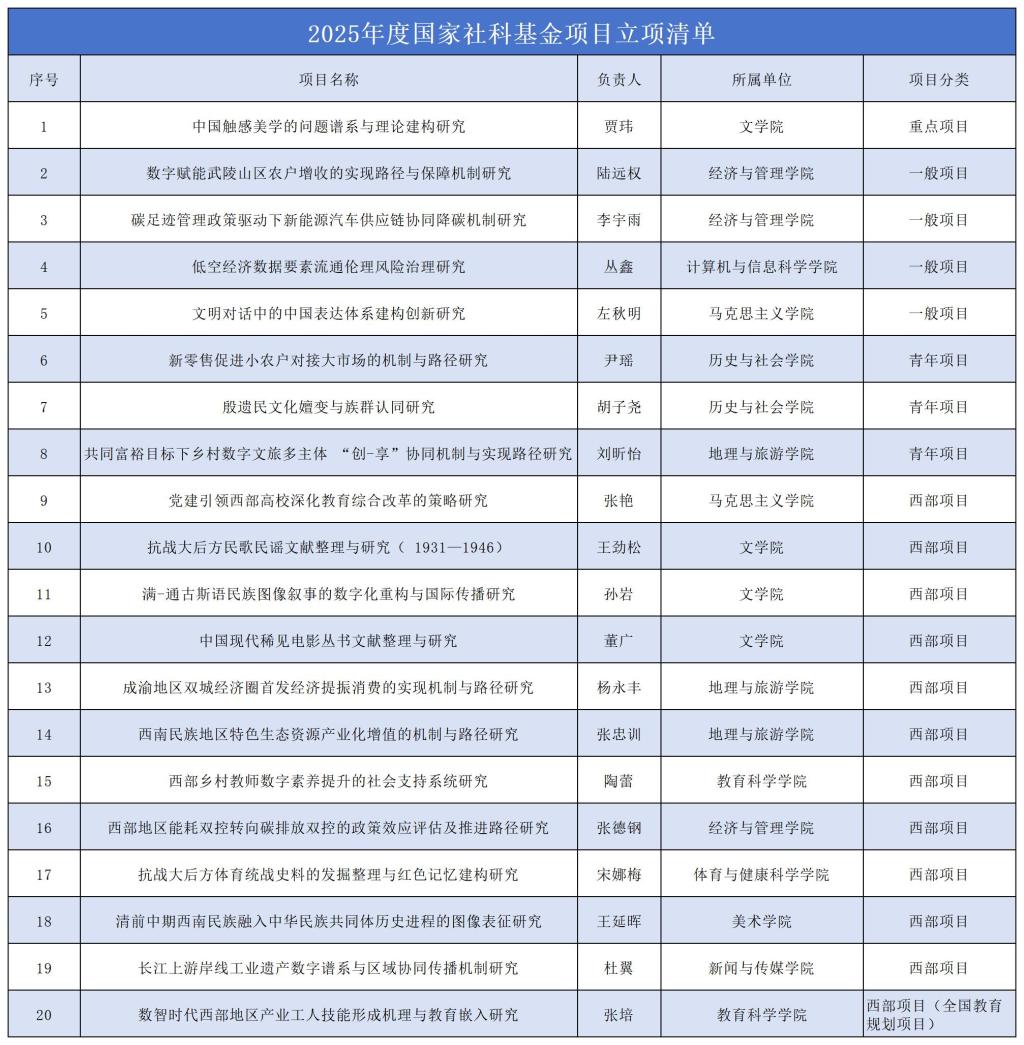 近年来,学校紧紧围绕国家重大战略和地方经济社会发展需求,加强顶层设计,优化资源配置,采取分学科精准指导、组织高水平项目申报辅导与论证会等举措,有效激发了广大教师的科研积极性,提升了项目申报质量,有力推动了学校哲学社会科学研究高质量发展。本次立项成绩的取得,是全校科研人员潜心钻研、勇于创新的结果,也是学校长期高度重视哲学社会科学研究、持续优化科研管理服务、积极营造浓厚学术氛围的集中体现。
