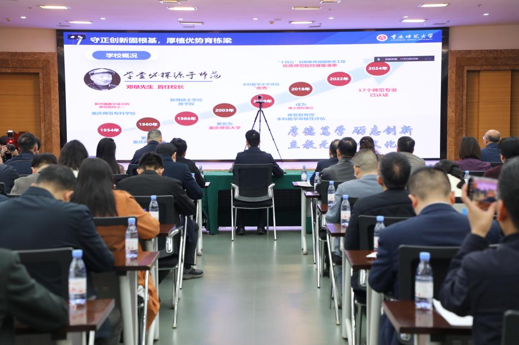 学校党委副书记、校长王国胤教授代表学校向出席会议的各位专家及领导表示热烈欢迎,对市教委、市教育评估院以及各兄弟院校长期给予的支持和帮助表示衷心感谢。他指出,自上一轮评估以来,学校扎实推进整改工作,对标新一轮评估指标,上下协同、三级联动,全校一盘棋,分阶段、分步骤有力有序开展自评自建工作。在“立体式大思政”工作格局、师范专业认证、新型二级学院建设、学科专业交叉融合、卓越教师培养、教学研究改革、师资队伍建设、数智化教学环境打造等方面均成效显著。