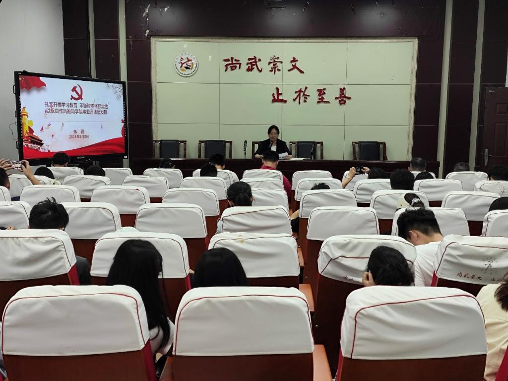 蒋霞同志为大家讲授题为《扎实开展学习教育,不断锤炼坚强党性,以优良作风推动学院事业高质量发展》党课。她从习近平总书记关于加强党的作风建设的重要论述、学校相关文件精神学习、以优良作风促进学院事业发展三个方面给大家做了精彩分享。希望党员同志们能够从查摆问题对照整改、认清形势推进改革、科学治理提质增效三个方面扎实开展学习教育,为促进学院的事业发展建言献策,紧紧跟随学校改革步伐,促进学院事业迈上新台阶。